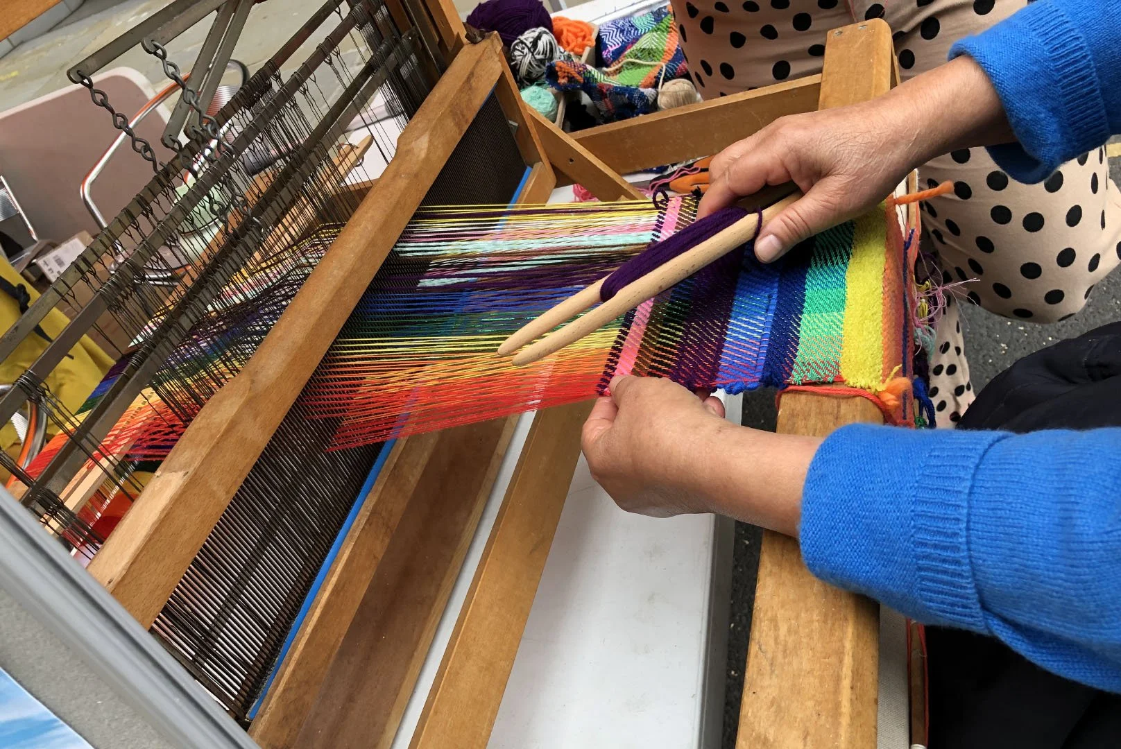 The Castlemilk Moorit sheep were the perfect ambassador for rare breeds and the important work that City Farms do to promote these important breeds. We also took along Beatrix, our one eared Herdwick, as the issue of dog attacks on livestock continues to be an increasing problem. Visitors to our stall were amazed to hear her story and it was encouraging to see how many of them really connected with her and will hope spread the message about dog attacks with their friends and families. We were also joined by Sally Holditch, our lovely weaver, who gave demonstrations to the public on our table top loom.