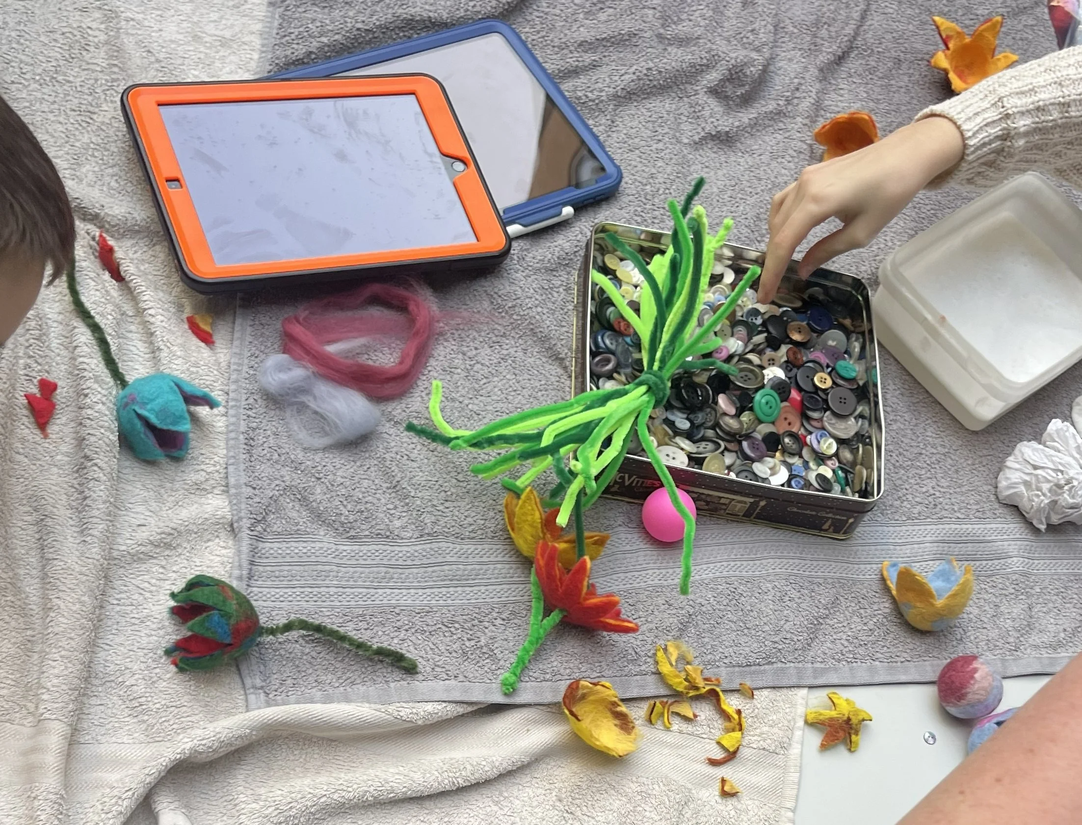This is a drop in session to make felted flowers to take home with you, from colourful wool and buttons. We will use a ping pong ball to form felted layers that magically turn into flowers. Prepare to get your hands soapy and wet!